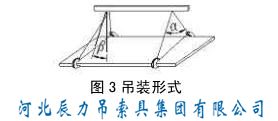 3.2  單板鉗與雙板鉗起吊鋼板時,必須與橫梁配套使用,其中α在(45-90)°之間,β在(0-15)°之間。橫梁的有效長度應不小于鋼板長的1/3。單板鉗或雙板鉗兩只試驗為額定載荷,四只為一組吊裝作業(yè),吊運過程中,鋼板應保持水平見圖3。
