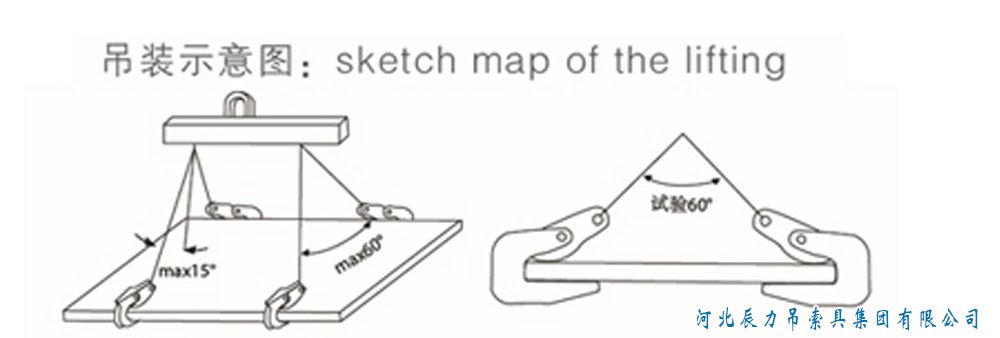 2.當采用如圖所示進行吊裝時,必須降低載荷使用,一般規定β≤45°。在β=45°時,橫吊起重鉗的起重載荷為原起重載荷的0.5倍,在β=30°時,橫吊起重鉗的起重載荷為原起重載荷為0.75倍。